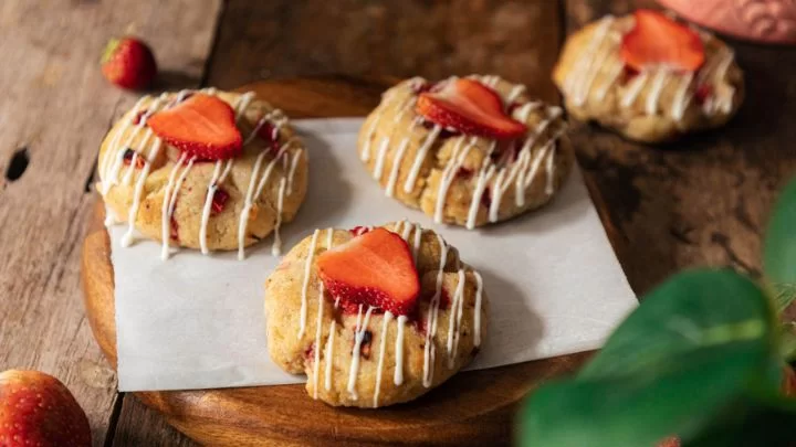در ادامه پنیر خامهای، بیکینگپودر و توت فرنگیهای تازه و نگینی خرد شده را به مخلوط بیفزایید. پس از استراحت کردن مواد در فریزر کوکیها را در فر بپزید.